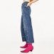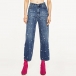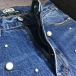 A pair of jeans featuring a high-rise waist, zip fly with button closure, whiskering, five-pocket construction, stonewash, front beaded design, wanna have one?
