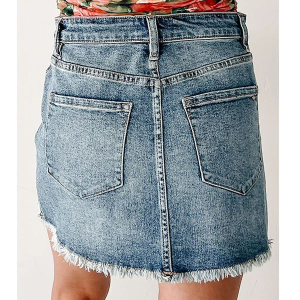 Meet your new wardrobe staple. This high-rise denim mini skirt perfectly blends retro vibes with modern edge. Crafted from durable yet comfortable denim, it features a beautifully faded vintage wash that looks like you've loved it for years. The flattering high-waisted silhouette cinches you in and elongates your legs, while the edgy frayed raw hem adds a touch of effortless, cool-girl attitude. Complete with classic pocket styling, this versatile piece is ready to take you from casual weekend brunches to summer music festivals.