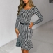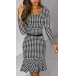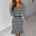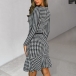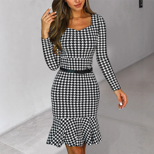 Vintage Houndstooth Pattern Square Neck Long Sleeve Ruffle Hemline Bodycon Dress