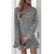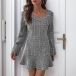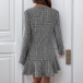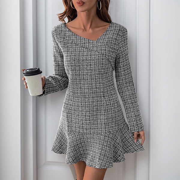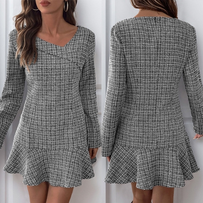 Vintage Irregular Neckline Long Sleeve Ruffle Hemline Tweed Dress