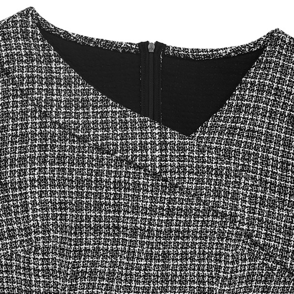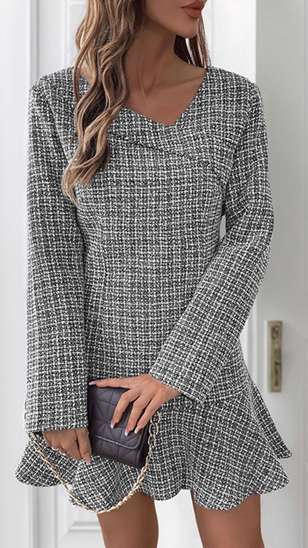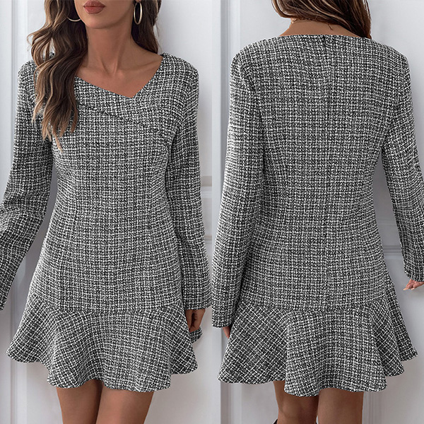 This tweed dress features a unique irregular neckline and elegant ruffle hemline that adds a playful and feminine touch, setting it apart from traditional designs. Pair it with heels for a polished look or dress it down with boots for a more relaxed vibe, making it suitable for various occasions.