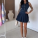 Vintage Lapel Collar Front Button Sleeveless Pleated Hemline Denim Dress with Belt