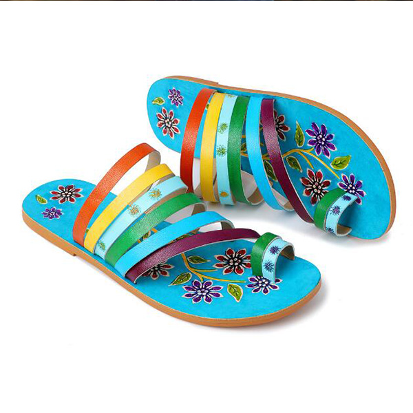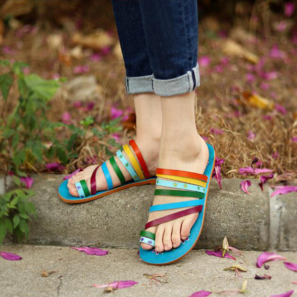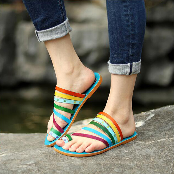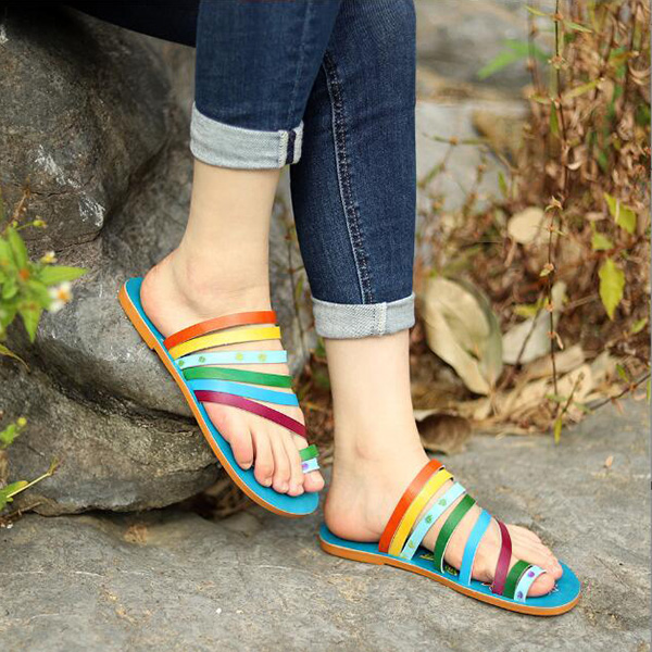 Vintage Leather Rainbow Stripe Contrasting Color Comfort Flip Flop Slippers