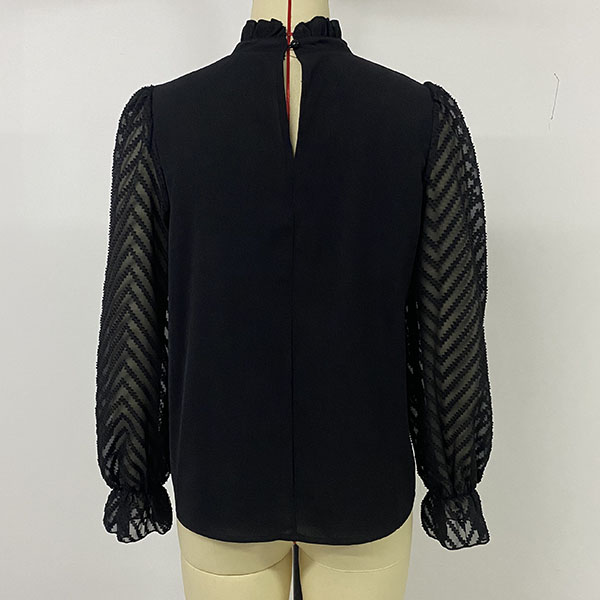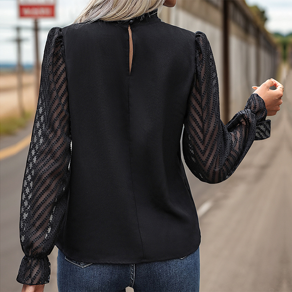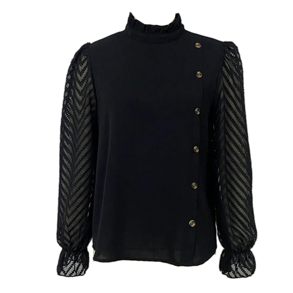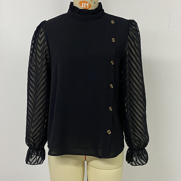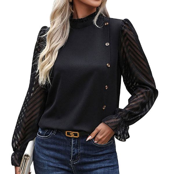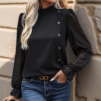 Vintage Mock Neck Gauze Spliced Long Sleeve Side Button Shirt