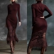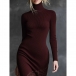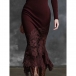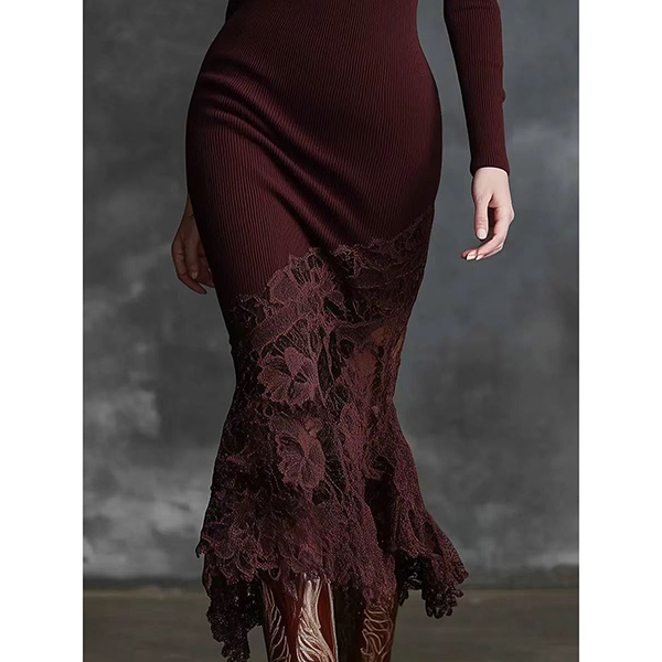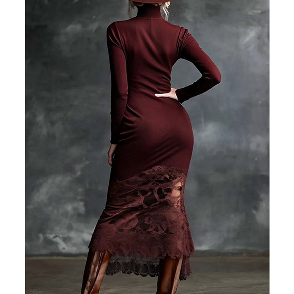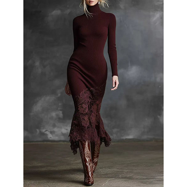 Vintage Mock Neck Long Sleeve Lace Spliced Fishtail Hemline Ribbed Bodycon Dress