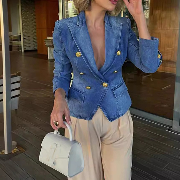 How about this retro jacket? The fusion of authentic old-washed denim character, formal notch lapel tailoring, structured double-breasted construction, and comprehensive long sleeve coverage creates a jacket that celebrates vintage sophistication through denim innovation.