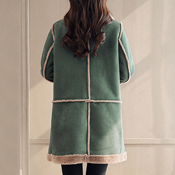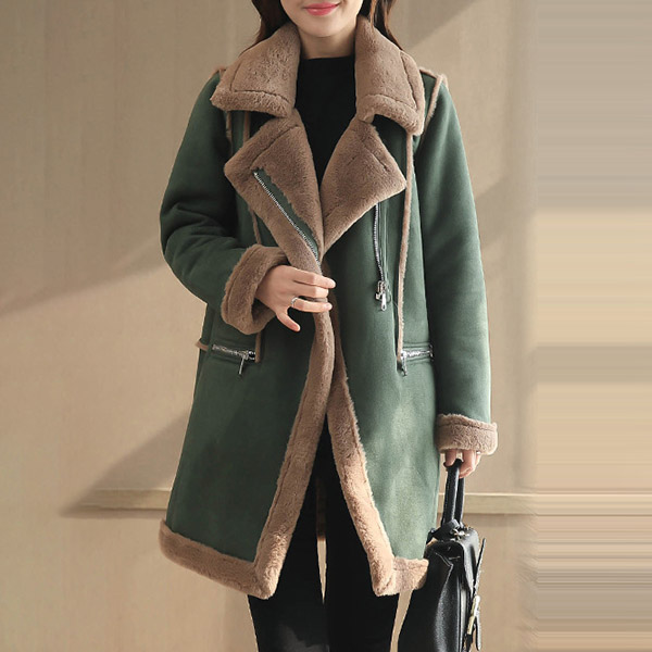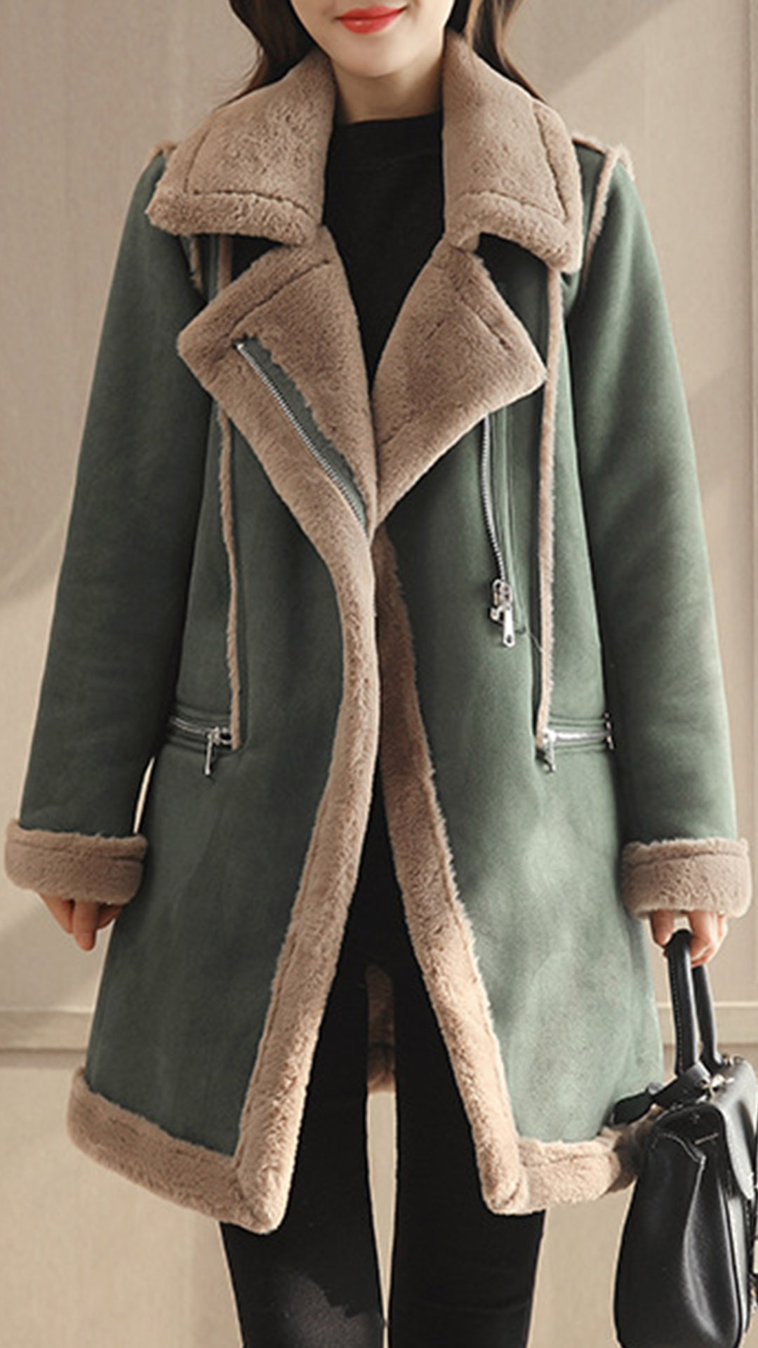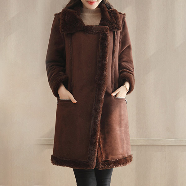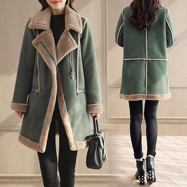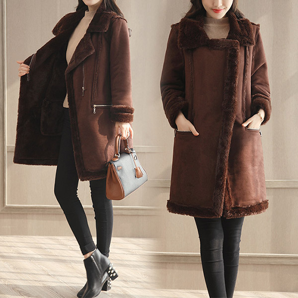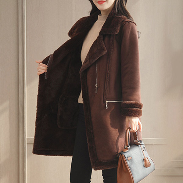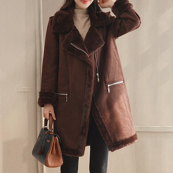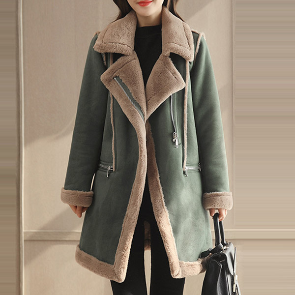 Vintage Notch Lapel Long Sleeve Slant Zipper Warm Plush Lined Coat for Women