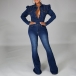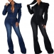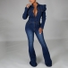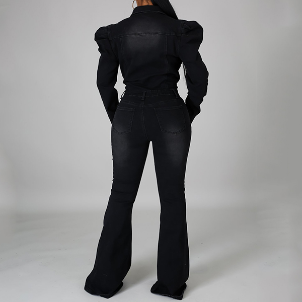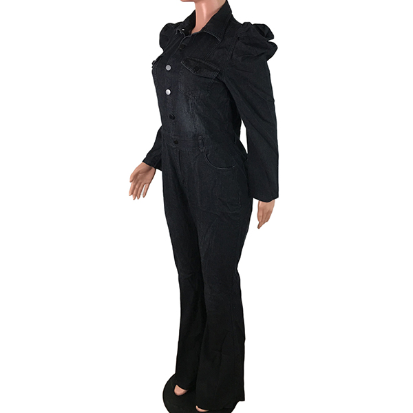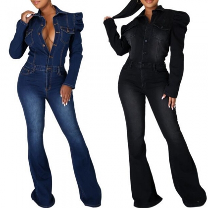 Vintage Old-washed Puff Long Sleeve Polo-neck Buttoned Wide-leg Denim Jumpsuit