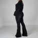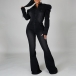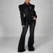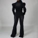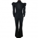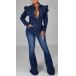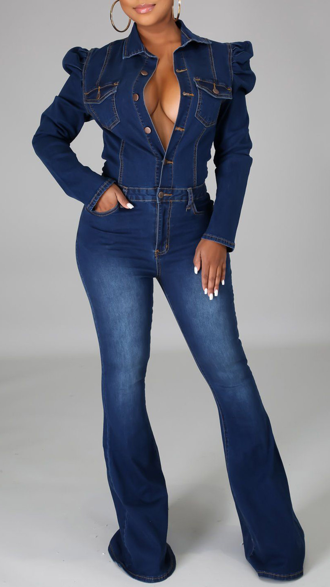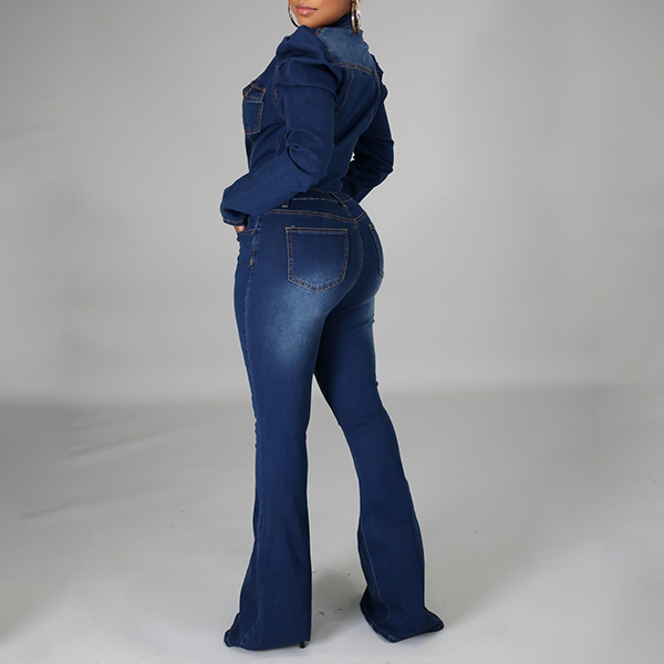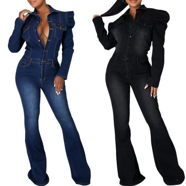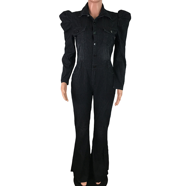 A denim jumpsuit featuring a stand collar, long puff sleeves, front button closure, front flap chest pockets, slanted pockets, a wide leg, and two back patch pockets.