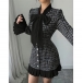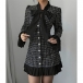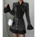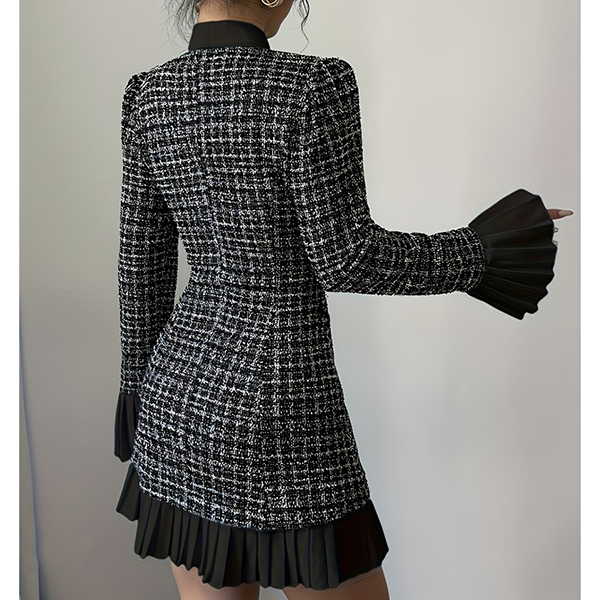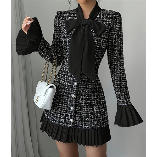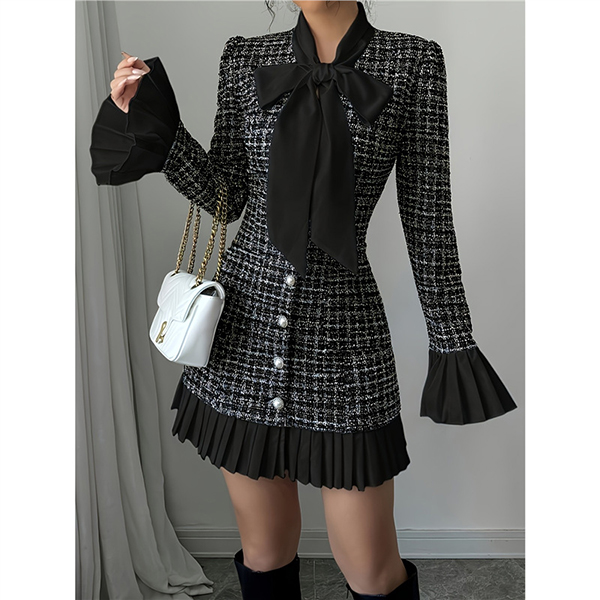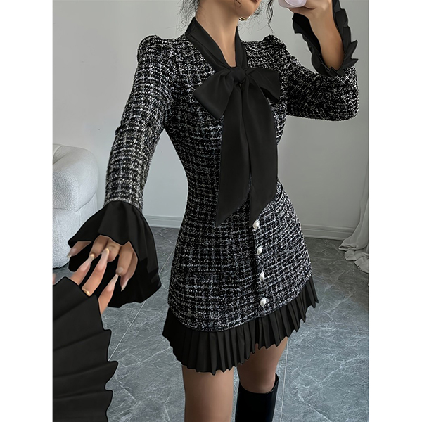Vintage Plaid Bowknot Crewneck Trumpet Long Sleeve Pleated Hemline A-lined Dress