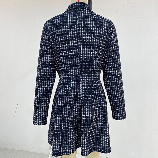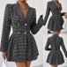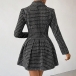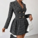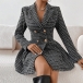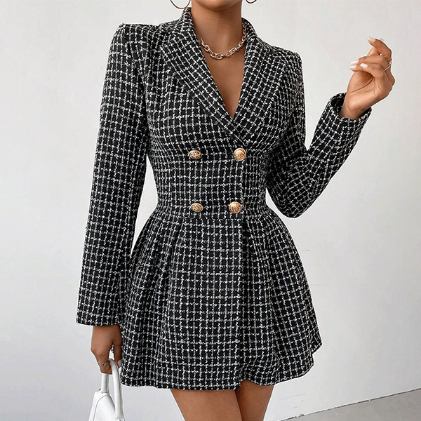 Vintage Plaid Double-breasted Notch Lapel Long Sleeve Pleated Suit Dress