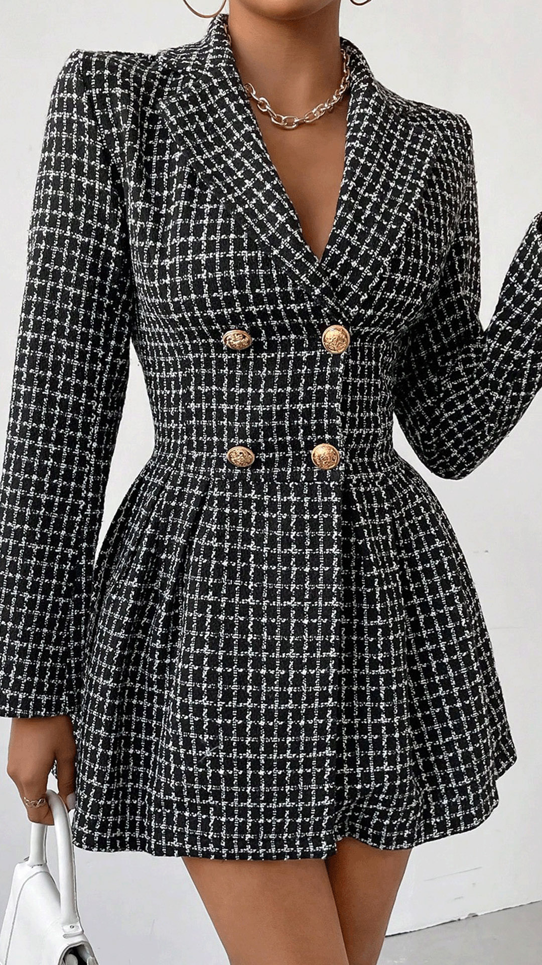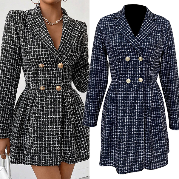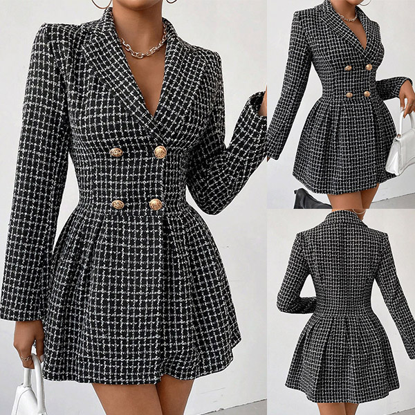 This suit dress features a plaid pattern, double-breasted design, notch lapel, long sleeves, and pleated skirt, creating a sophisticated and timeless look. Pair it with heels and a structured handbag for a chic and elegant outfit.