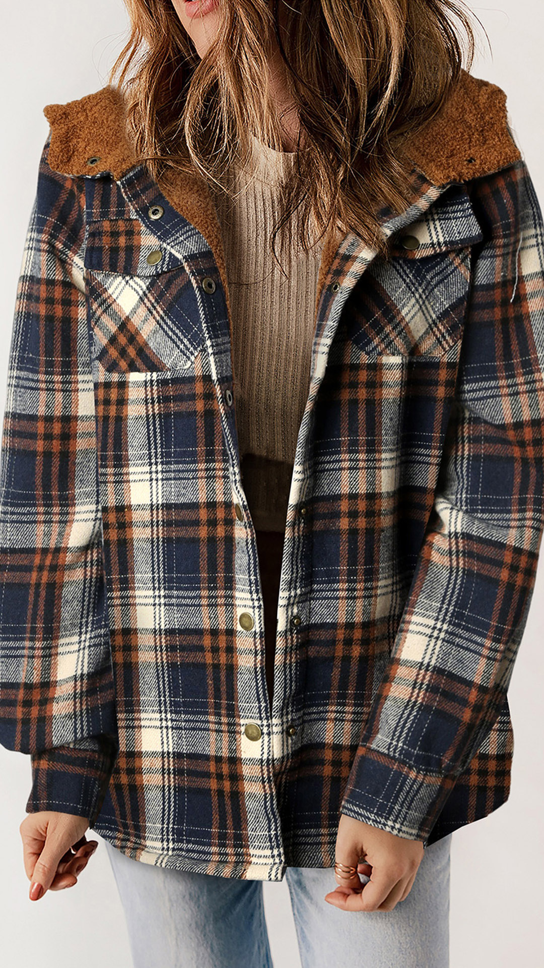 Vintage Plaid Hooded Long Sleeve Plush Lined Jacket