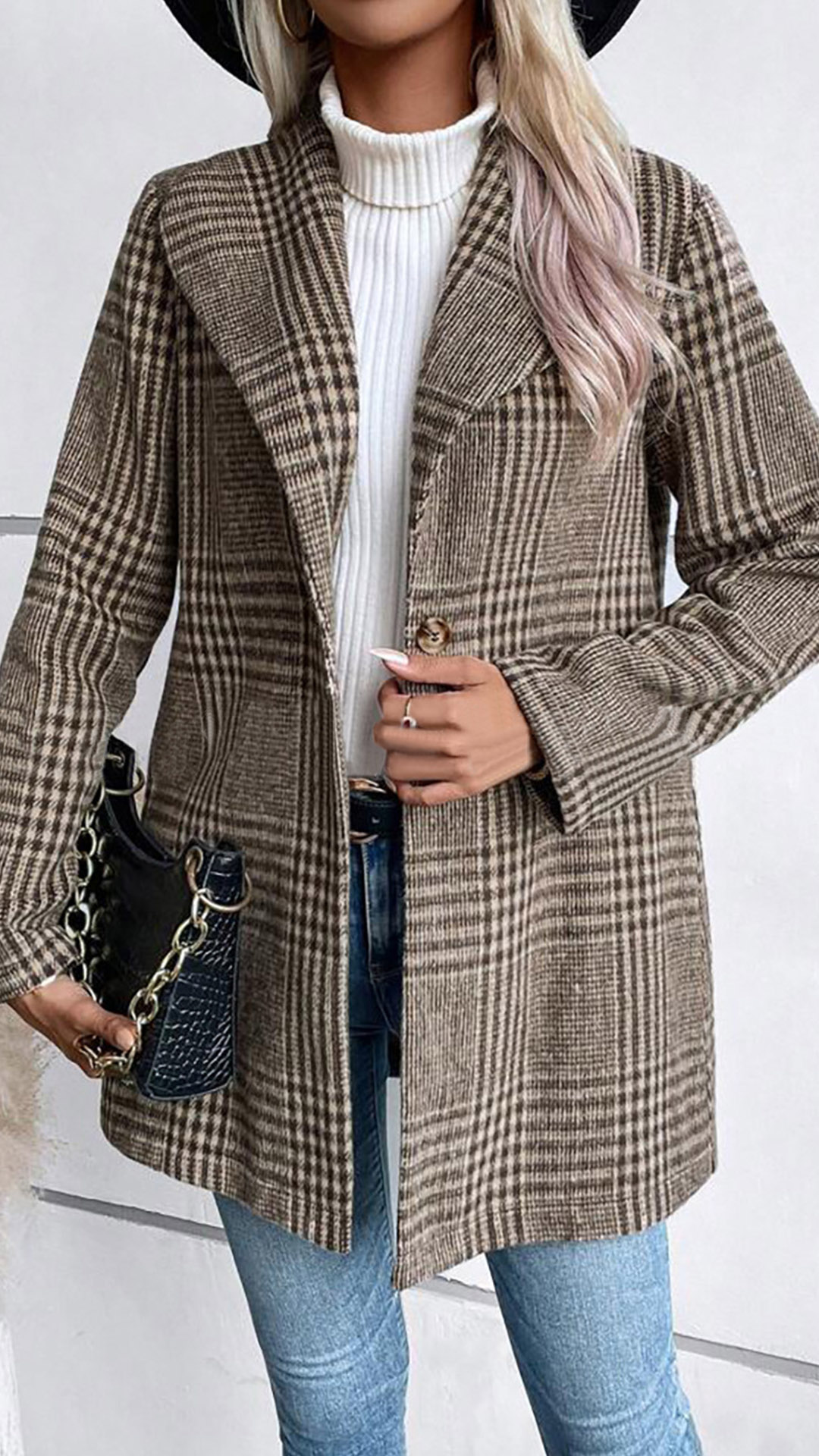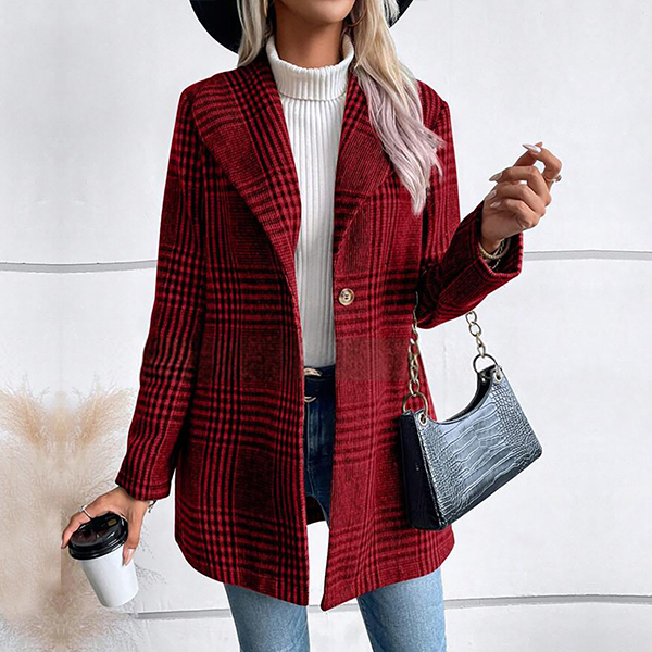 This vintage-inspired blazer features a plaid pattern, lapel collar, and long sleeves, creating a classic and sophisticated look. Color: Red, Apricot, which one do you like?