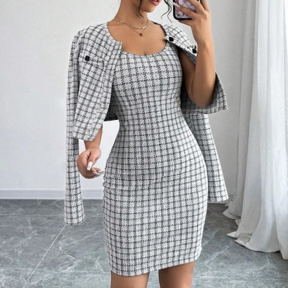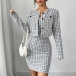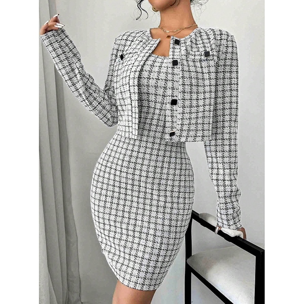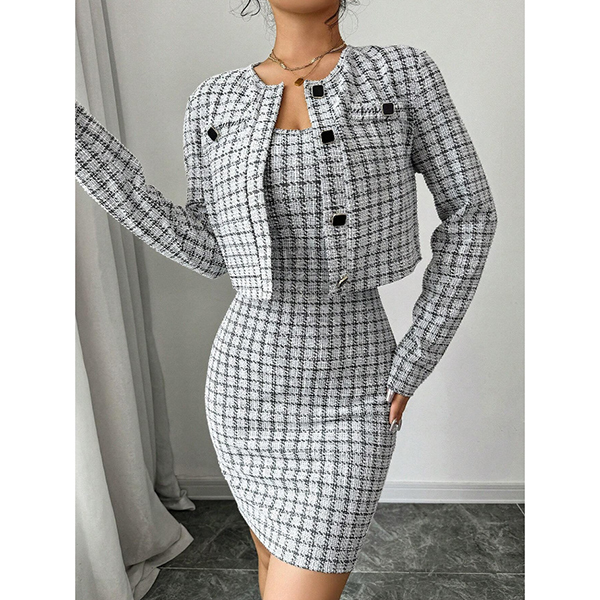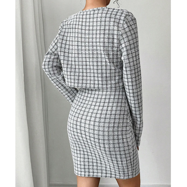 Vintage Plaid Two-piece Set Consist of Crop Jacket and Bodycon Dress