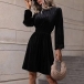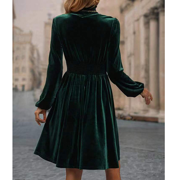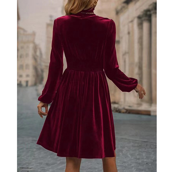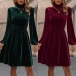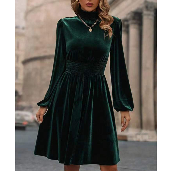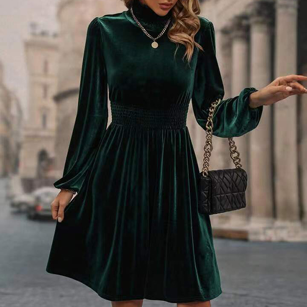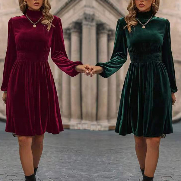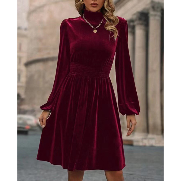 Fashion Solid Color Mock Neck Long Sleeve Smocked Waist Velvet Dress
