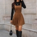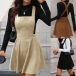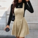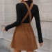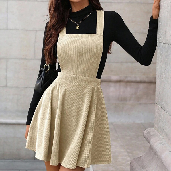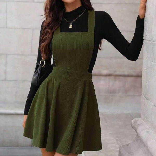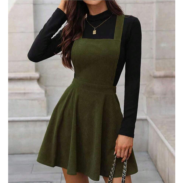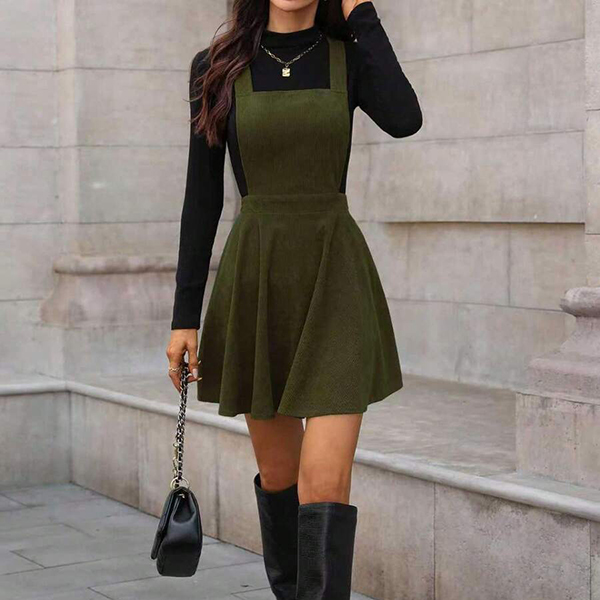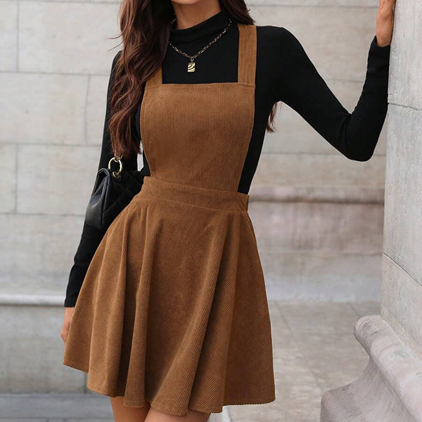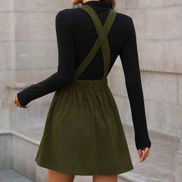 Vintage Solid Color Elastic Waist Corduroy Suspender Dress