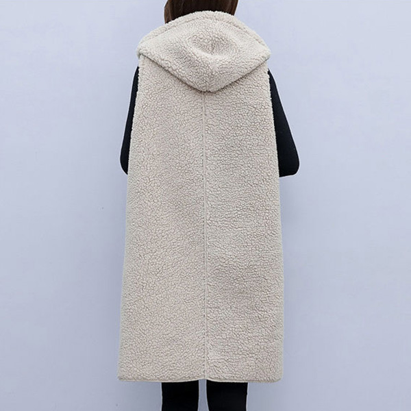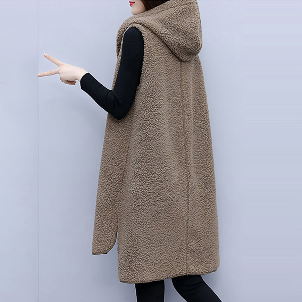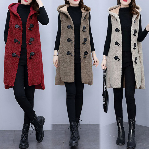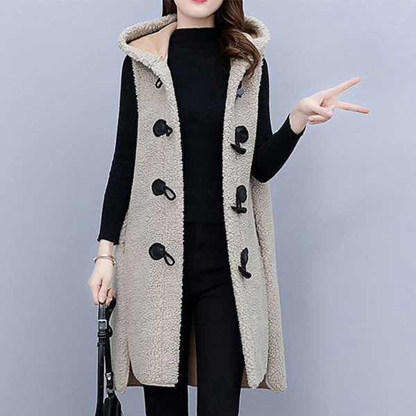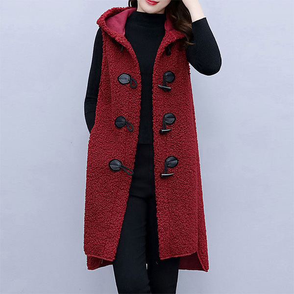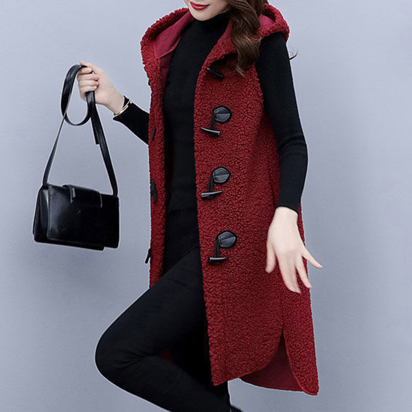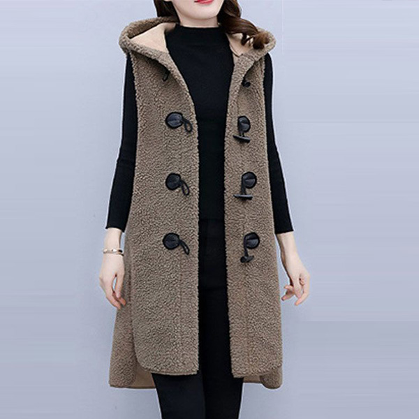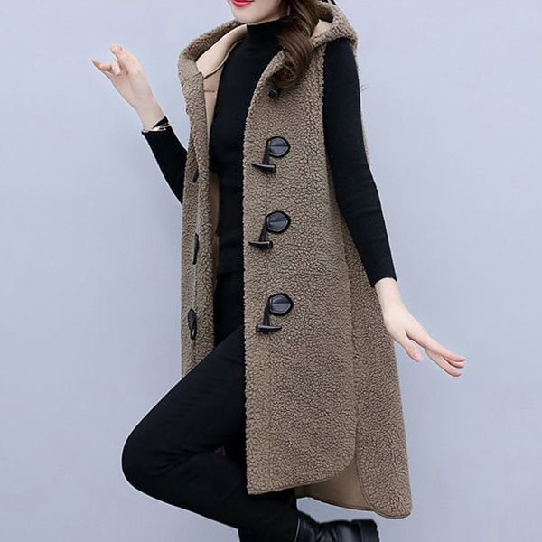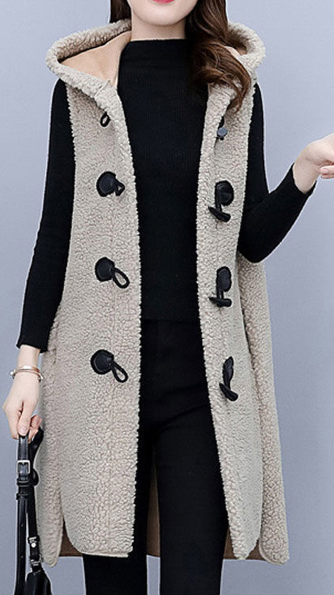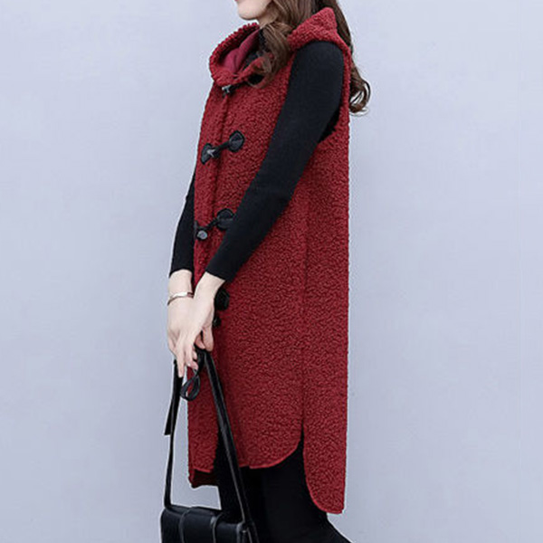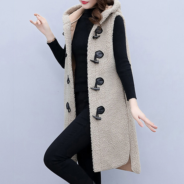 Vintage Solid Color Horn Buckle Hooded Sleeveless Plush Jacket