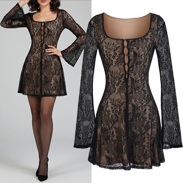 This dress features charming vintage styling with elegant square neck construction and romantic lace fabric for nostalgic timeless elegance. Perfect for vintage occasions, romantic styling, or sophisticated nostalgic coordination.
