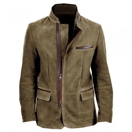 Vintage Stand Collar Artificial Leather Spliced Long Sleeve Jacket for Men
