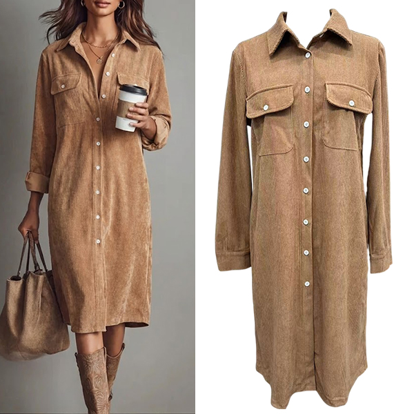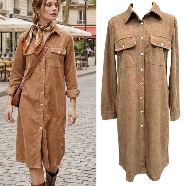 This charming shirt dress features classic corduroy fabric with vintage-inspired tailoring details. The stand collar creates sophisticated neckline whilst patch chest pockets add authentic workwear functionality and retro charm. Perfect for autumn styling, vintage-themed events, or casual weekend wear with retro flair.