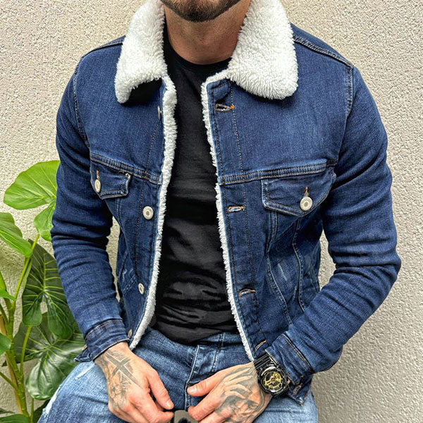 Vintage Stand Collar Long Sleeve Plushed Lined Old-washed Denim Jacket for Men