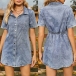 Vintage Stand Collar Short Sleeve Cinch Waist Front Button Old-wash Mini Denim Dress