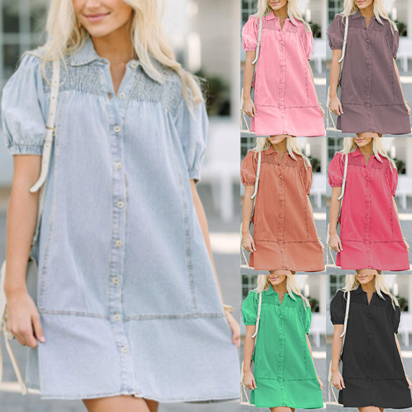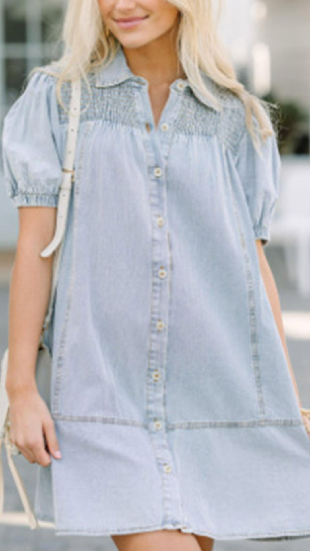 This denim dress exudes a classic and timeless appeal with its stand collar, short sleeves, and front button closure, all crafted from durable and versatile denim fabric. Multi-colors avabile.