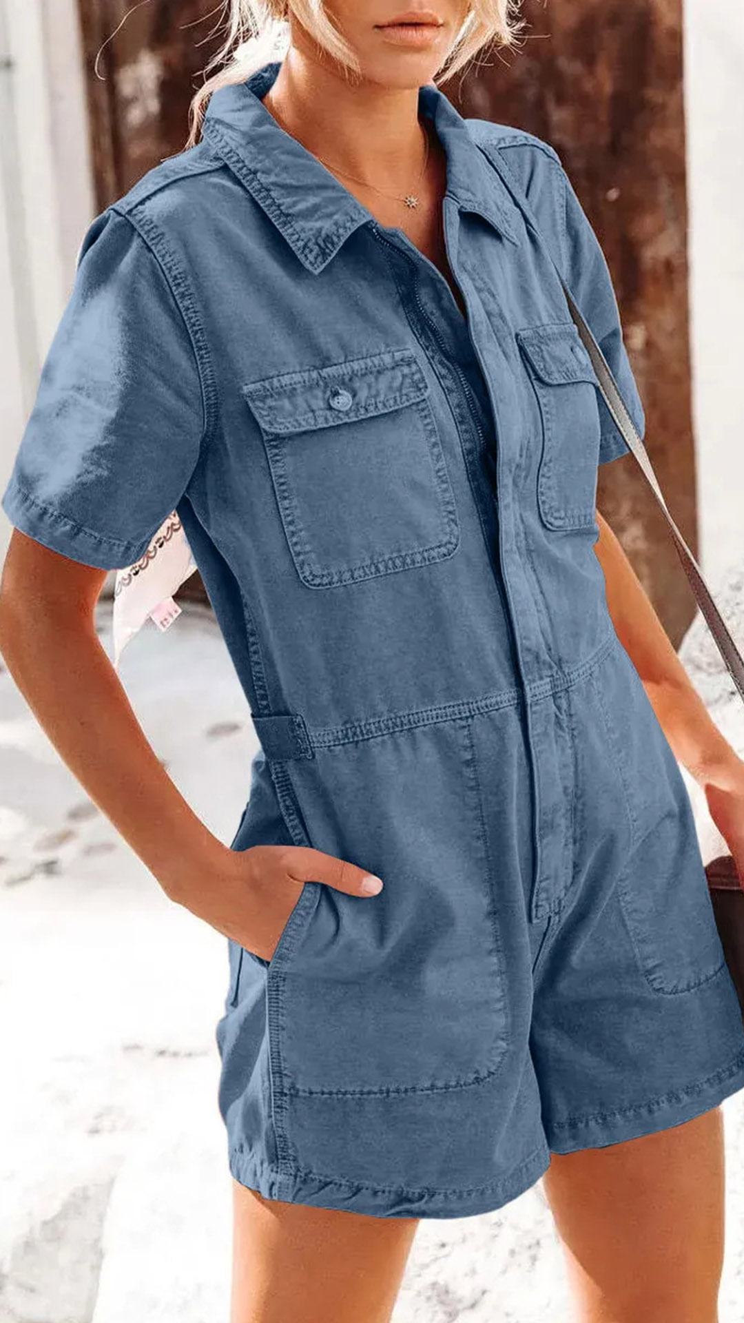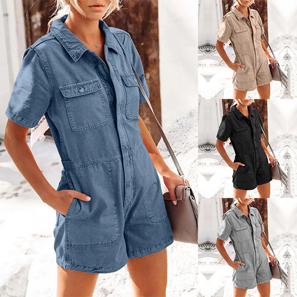 Vintage Stand Collar Short Sleeve Patch Pockets Denim Romper