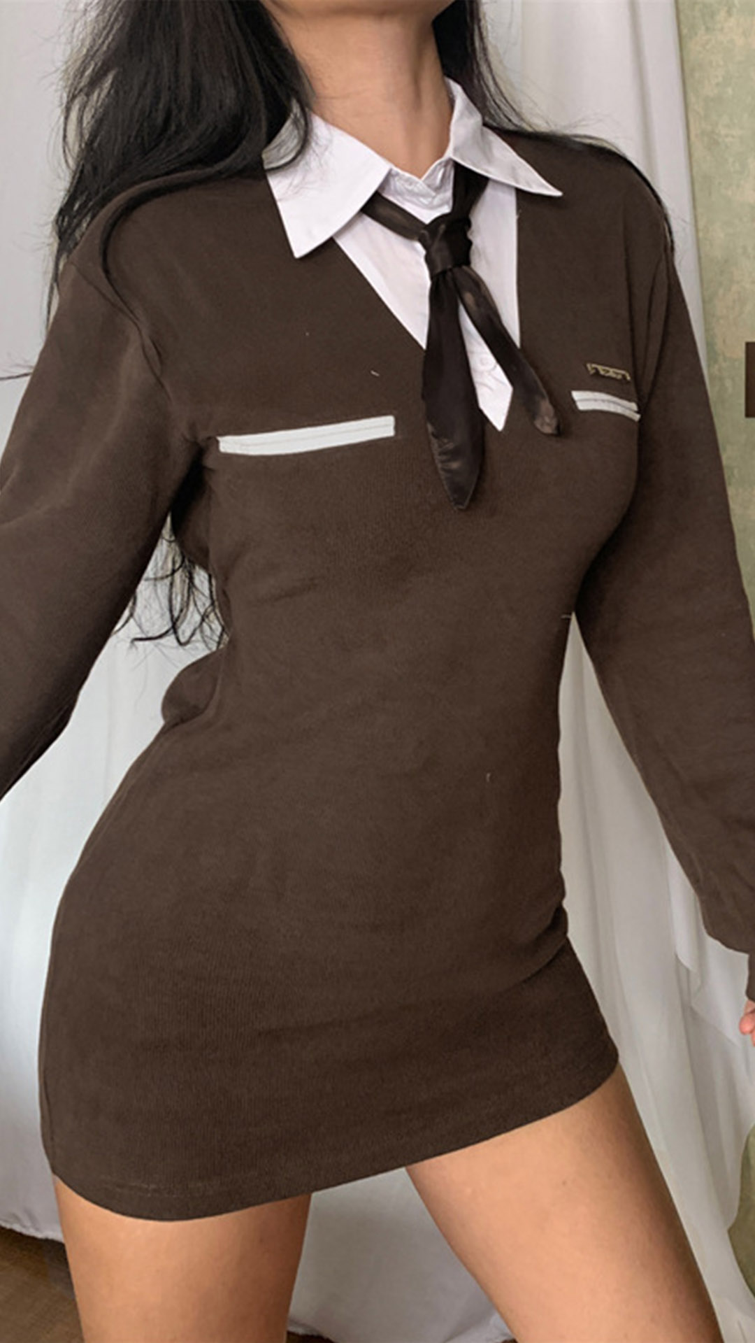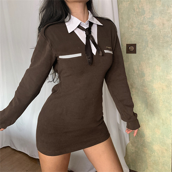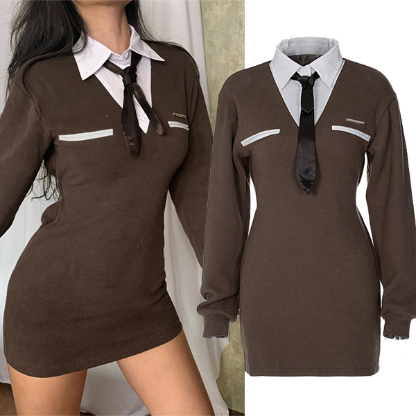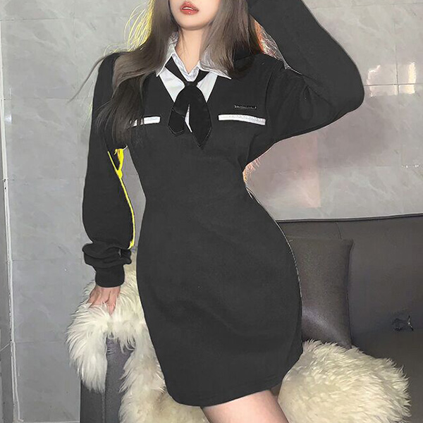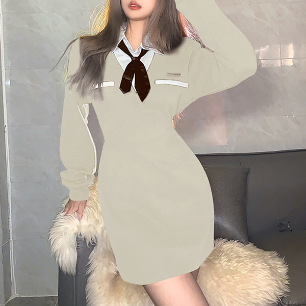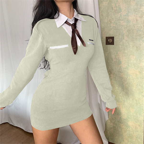 How about this dress? It features a contrast color stand collar with tie giving it a timeless and classic look. The fake-two-piece design gives it a modern twist, making it perfect for any occasion. The fabric is lightweight and breathable, ensuring you stay comfortable all day long.