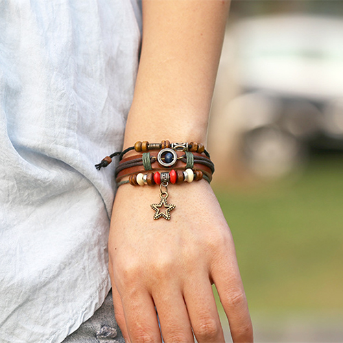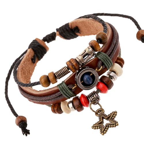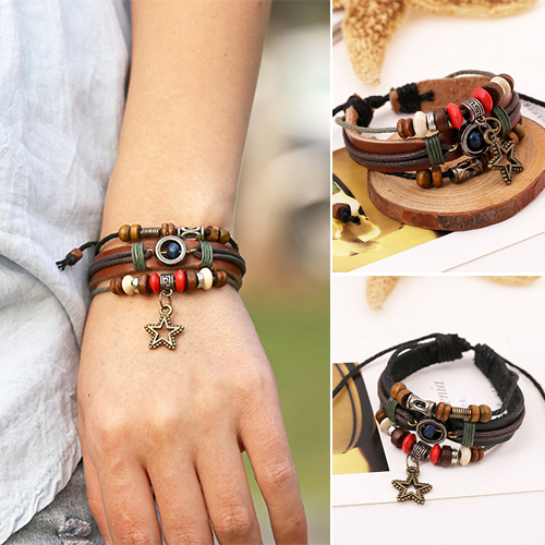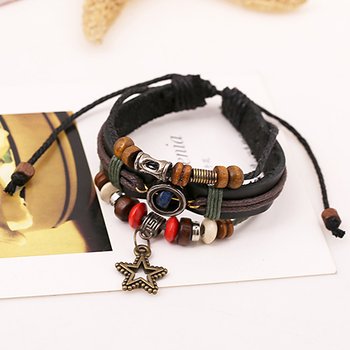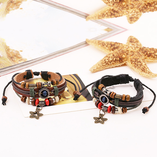 Vintage Style Pentagram Pendant Beaded PU Leather Bracelet