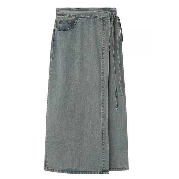 Channel the ultimate street-style vibe with this distinctive wrap denim skirt. Featuring a unique "old-washed" finish with a subtle vintage tint, this piece stands out from standard blue denim. The functional wrap design secures with a chic side tie, creating a flattering high-waisted silhouette that fits perfectly. A daring high slit adds a touch of allure and ensures ease of movement, making it perfect for urban adventures.