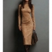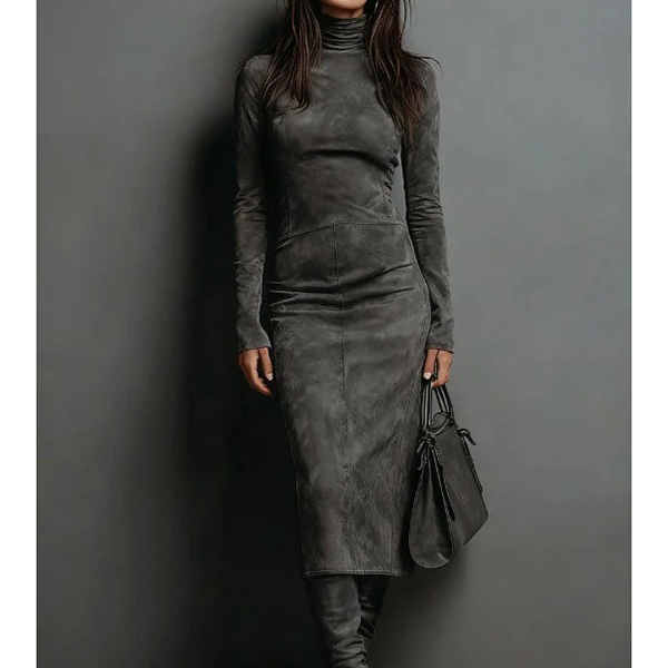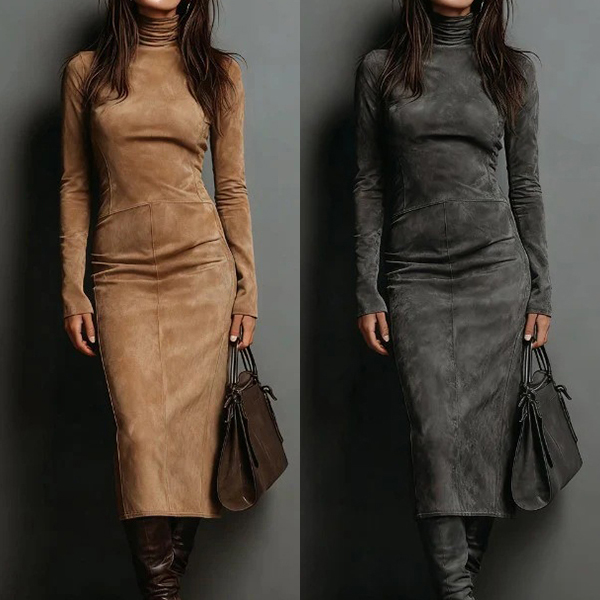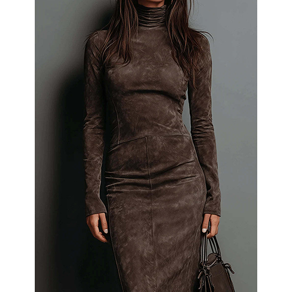 This dress features cozy turtleneck styling with figure-hugging bodycon silhouette and elegant midi length for vintage-inspired refined sophistication. Perfect for daily wear.