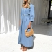 Vintage V-neck Long Sleeve Front Button Old-washed Denim Dress with Belt
