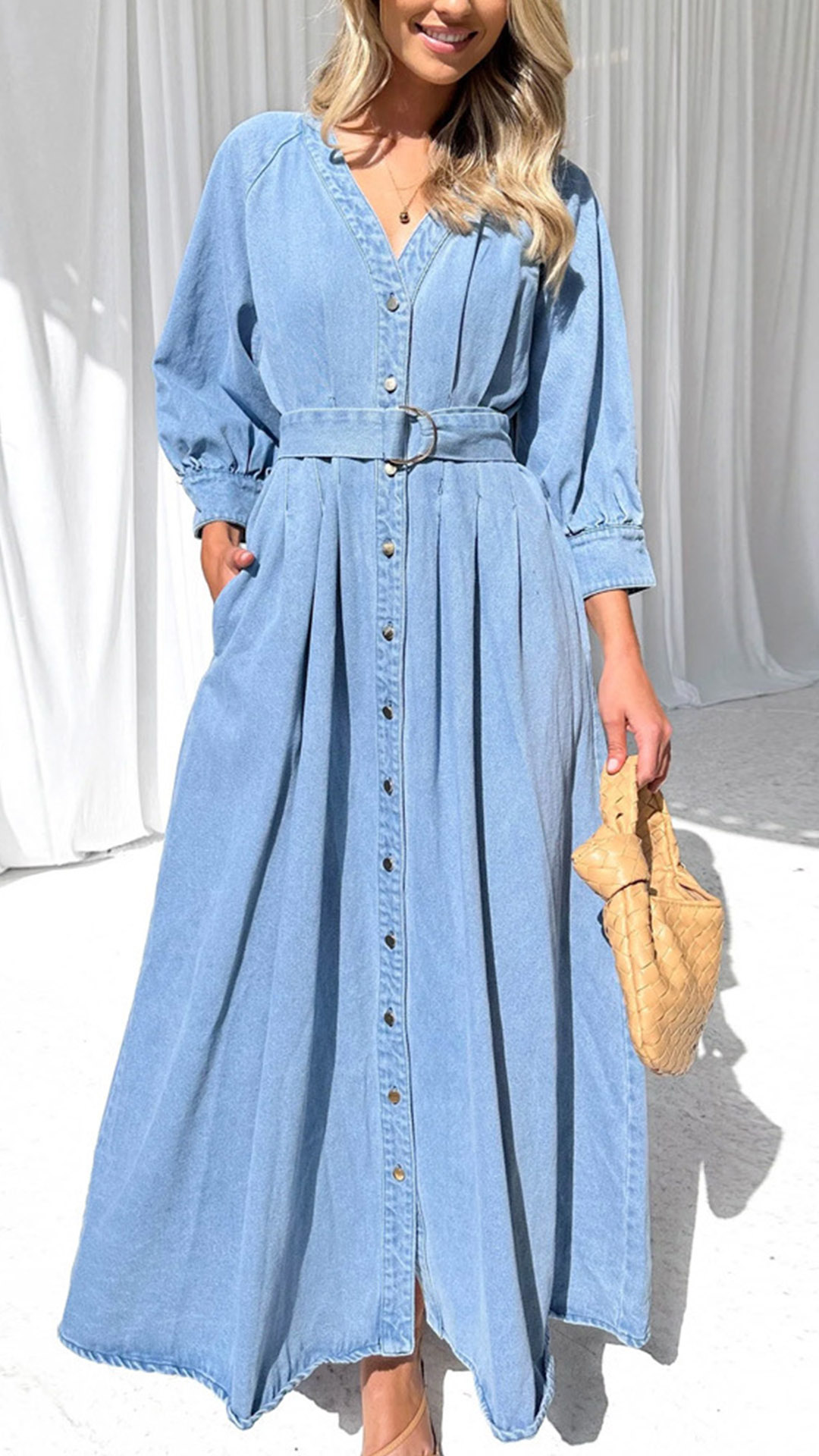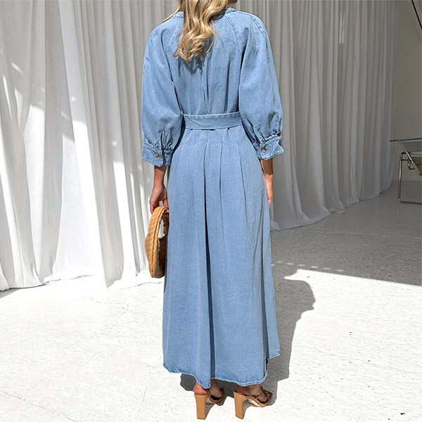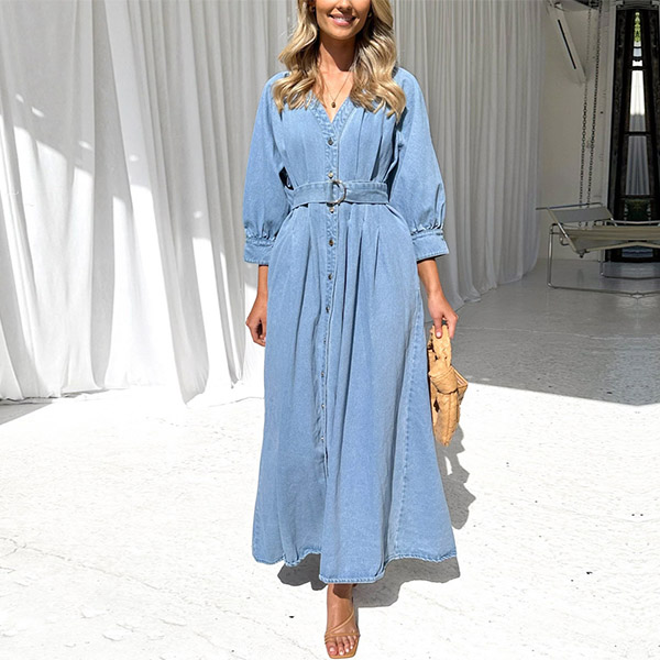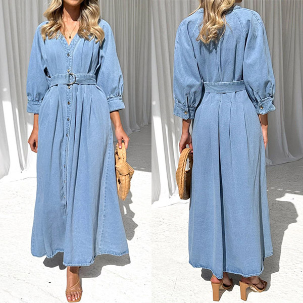 Step back in time with this vintage-inspired denim dress with a belt. The V-neck design adds a touch of femininity and elegance to the dress. The front button detailing gives the dress a retro and classic look, reminiscent of old-school denim styles. The old-washed denim fabric adds a vintage and worn-in feel, perfect for achieving a laid-back and effortless vibe. Wanna have a try?