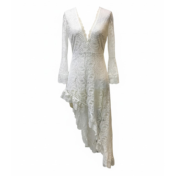 This romantic dress features elegant V-neck styling with delicate semi-sheer lace construction and artistic irregular hemline for vintage-inspired sophisticated charm. Perfect for vintage-inspired occasions, romantic styling, or contemporary elegant wear.