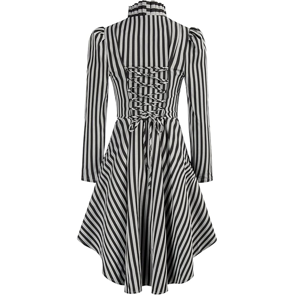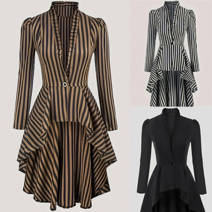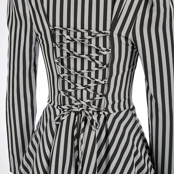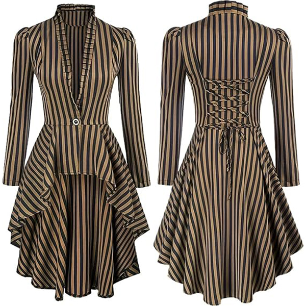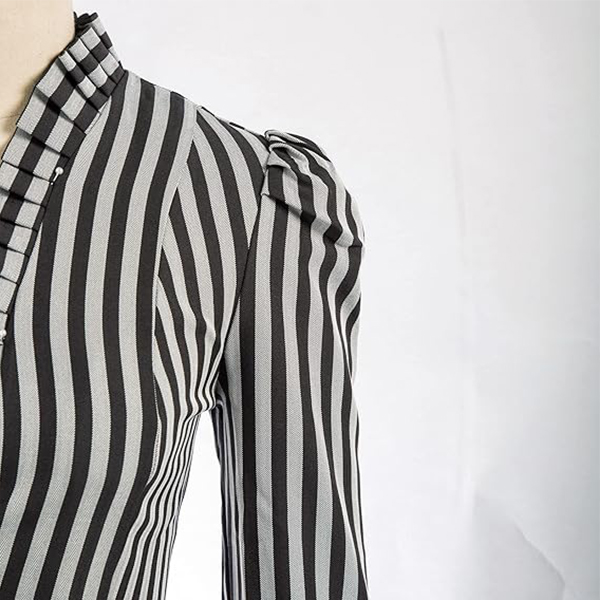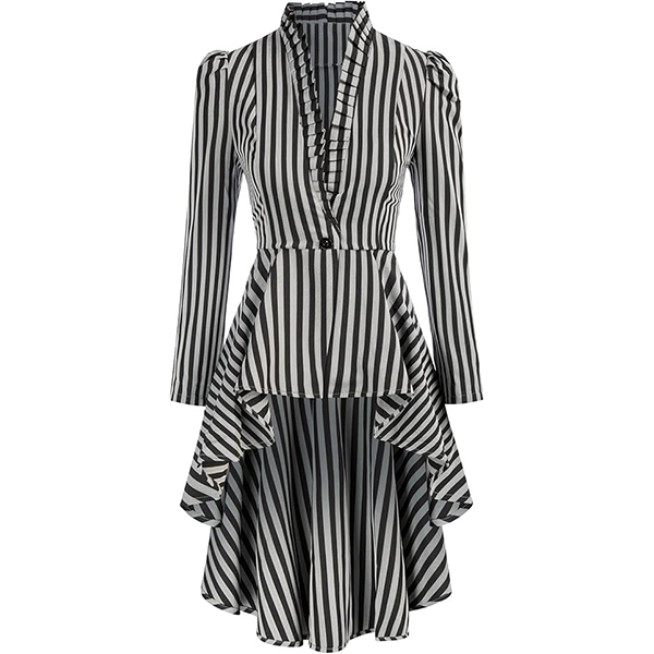 This vintage-inspired shirt features a vertical striped print, V-neckline, long sleeves, and a high-low hemline, creating a classic and elegant look. Pair it with jeans or trousers for a classic and polished look. Also, it is a perfect shirt for cosplay or some other theme parties.