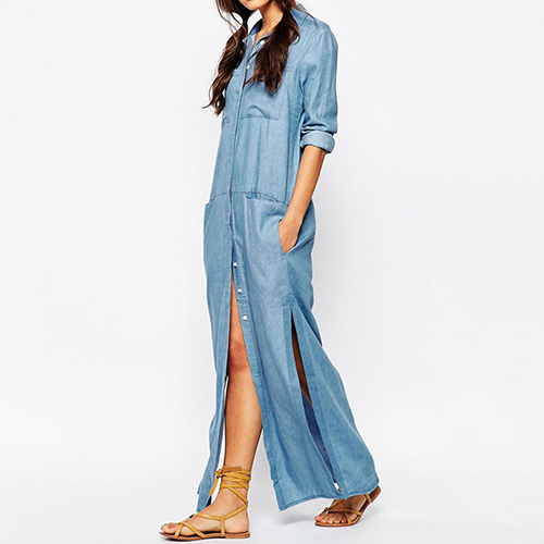 Fashionable denim dress always makes you stand out from the crowd. With covered button and slit hem design,