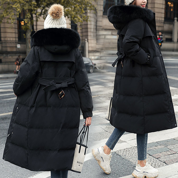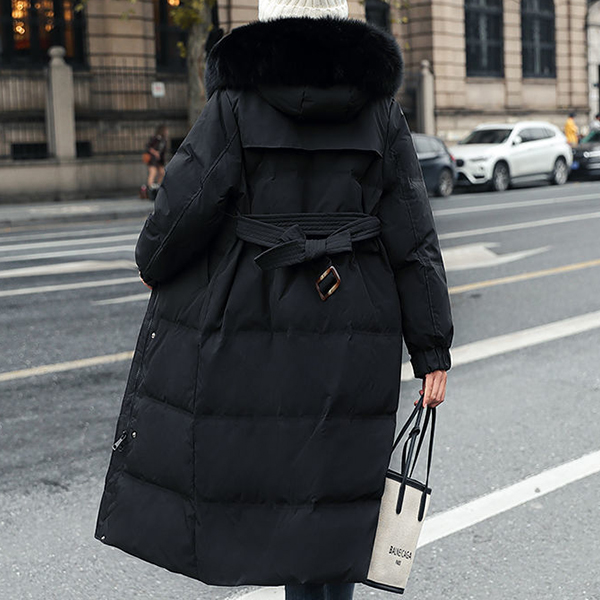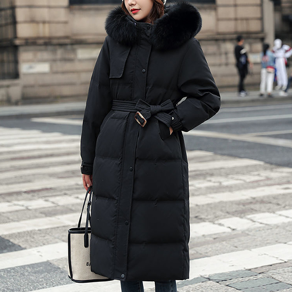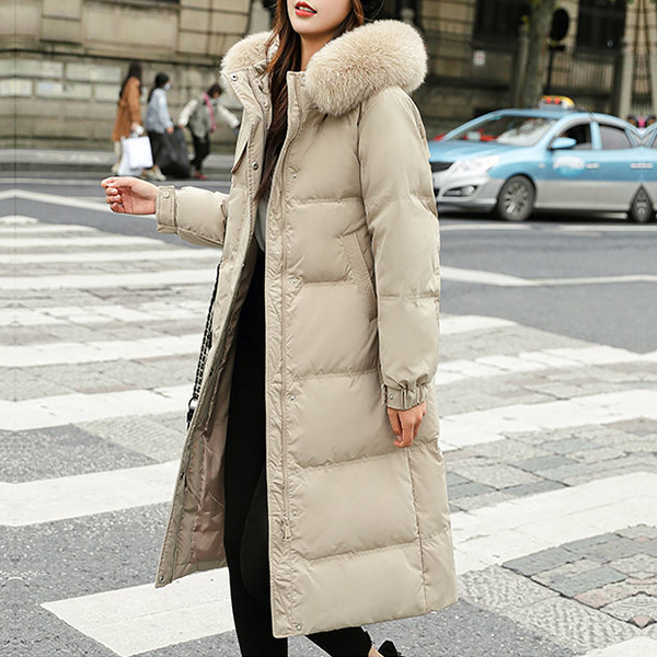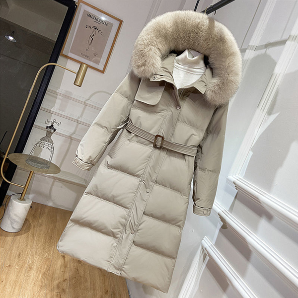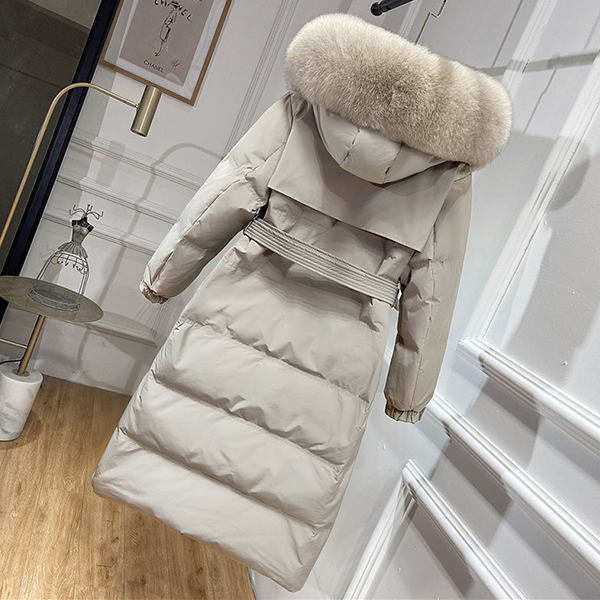 Waist Slim Down Coat with White Duck Down and Faux Fur Collar Trim