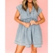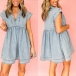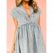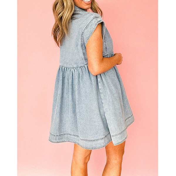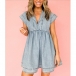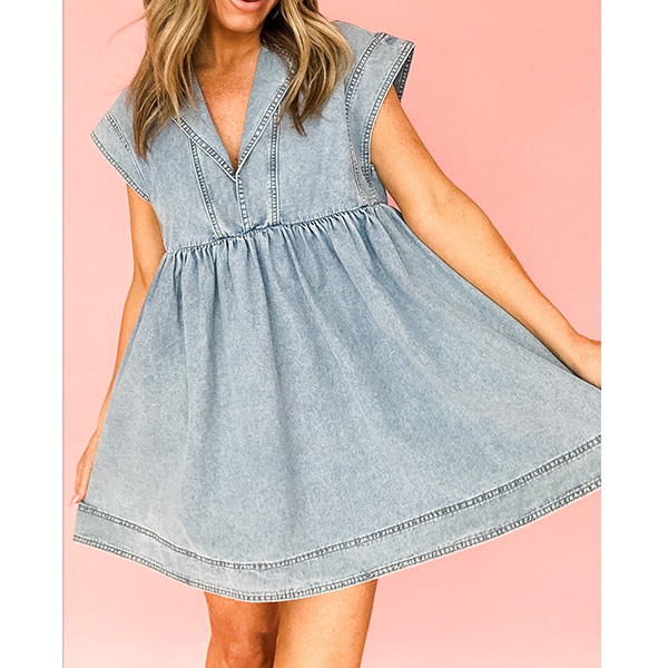 Washed Denim Dress with Distressed V-neck, Ruffled Hem and Short Sleeves