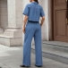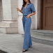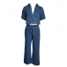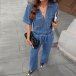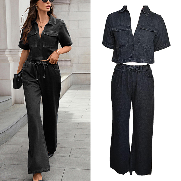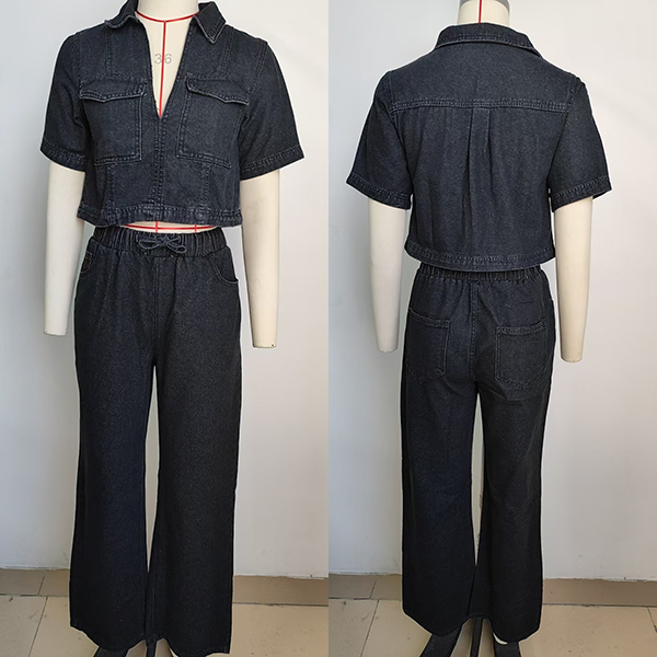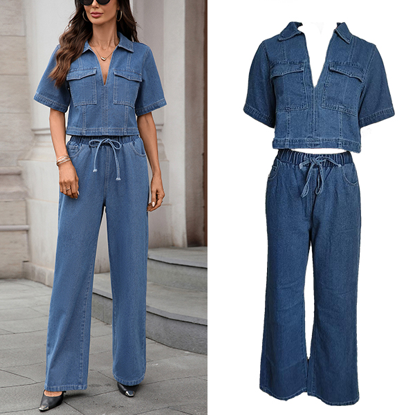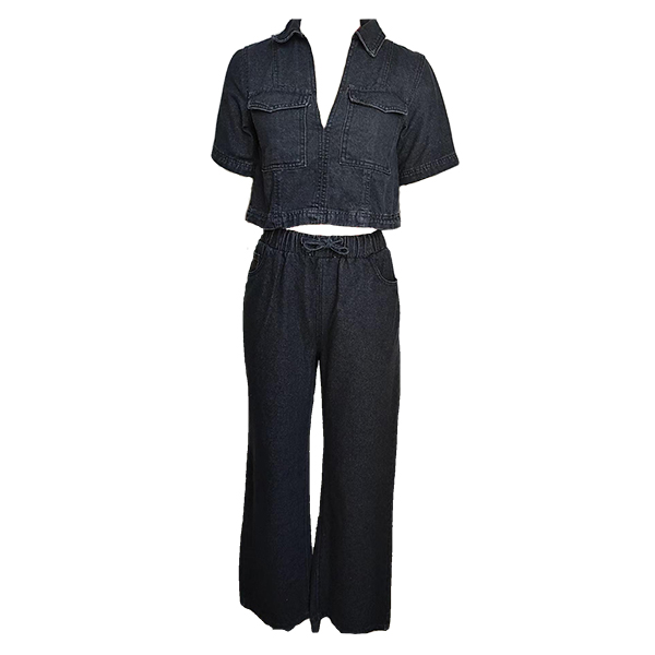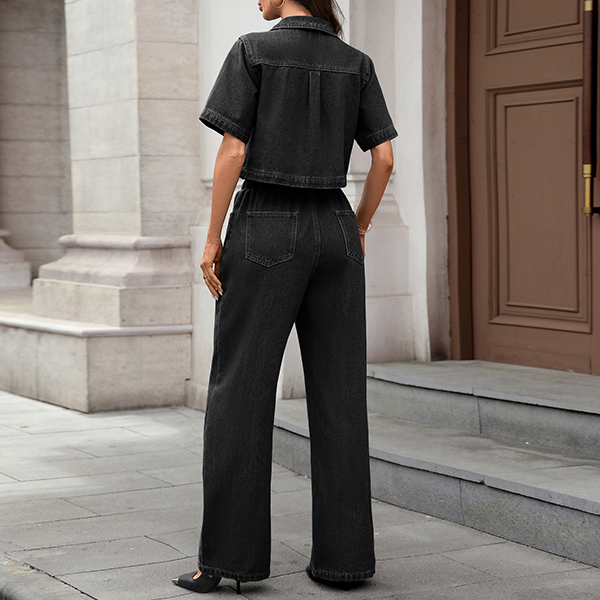 Fashion Denim Two-piece Set Consist of Crop Denim Shirt and Straight-cut Denim Pants