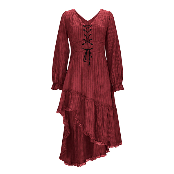 Western Boho Dress - Lace-Up Front with High-Low Ruffle Hem