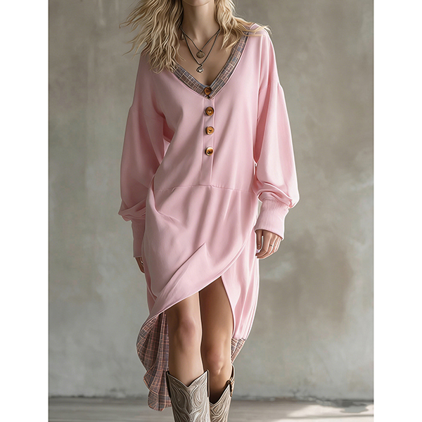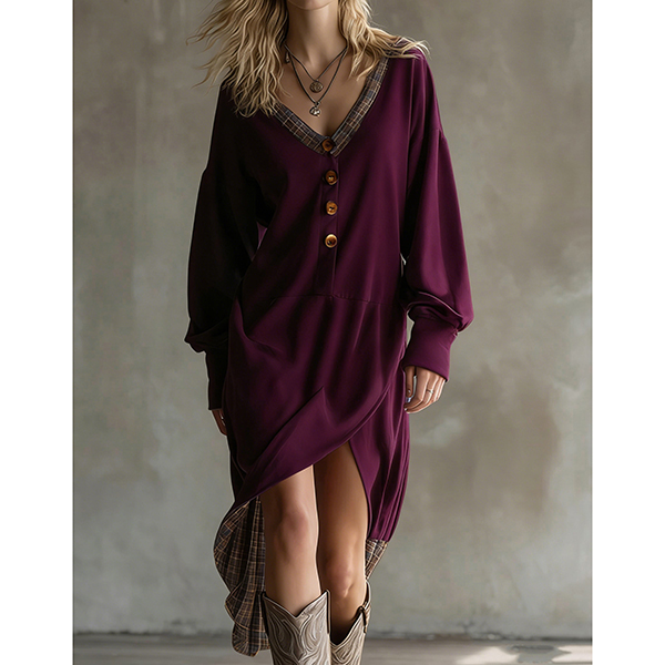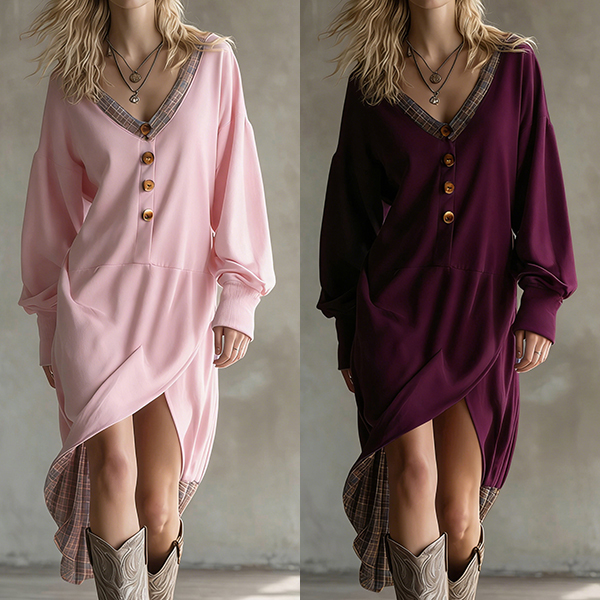 Embrace a blend of cozy comfort and rugged style with this unique sweatshirt dress. Perfect for transitioning between seasons, this piece combines the relaxed feel of your favorite loungewear with striking design details that make a statement.