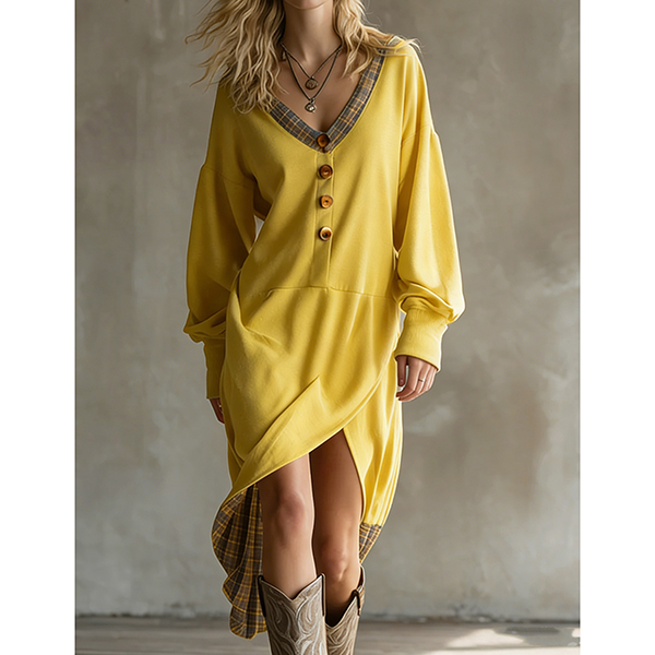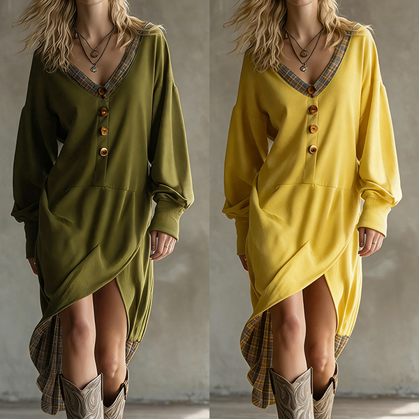 Western Chic Plaid Trim V-Neck Midi Dress with Side Slit