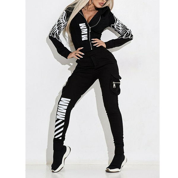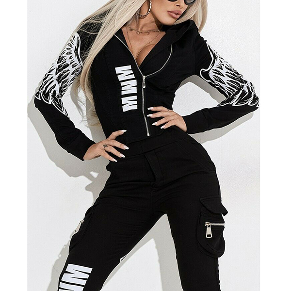 Wing Print Hooded Tracksuit with Zipper Street Style