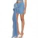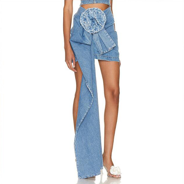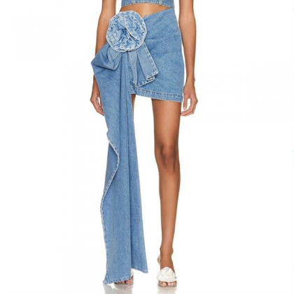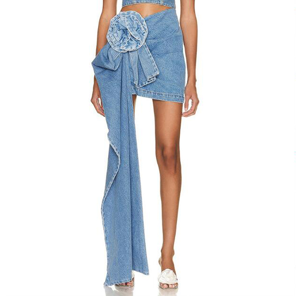 Womens 3D Floral Denim High Waist Skirt Fall New Arrival with Drape Layering and Spliced Ribbon Trim