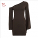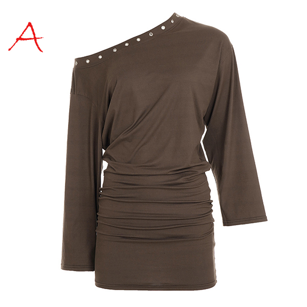 Women's Asymmetric Off-Shoulder Mini Dress - Long Sleeve Batwing Bodycon with Metal Grommet Neckline Detail