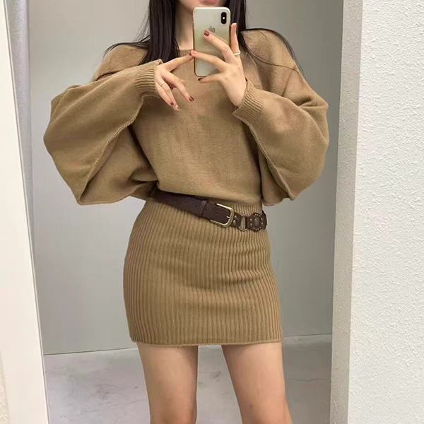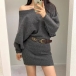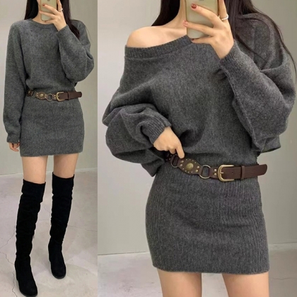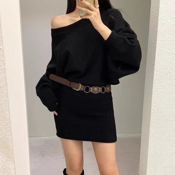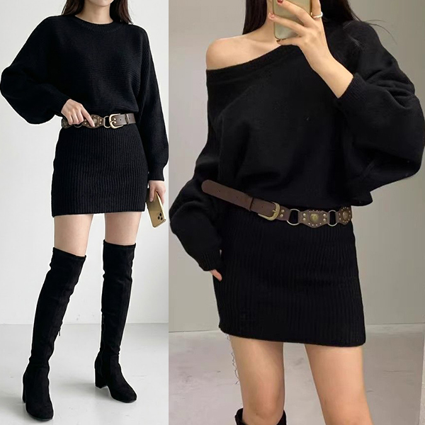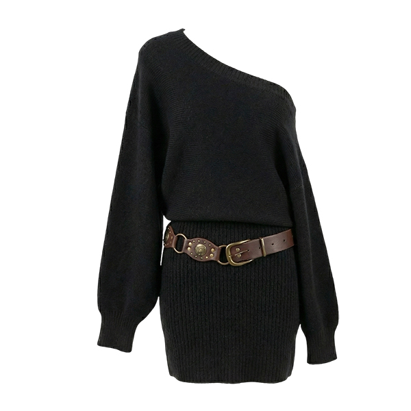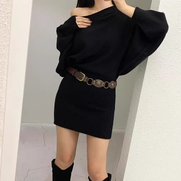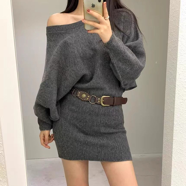 This sweater dress features contemporary asymmetric slant neckline styling with dramatic batwing sleeves and figure-hugging bodycon silhouette for modern artistic elegance. Pair with boots and modern accessories for sophisticated contemporary appeal.