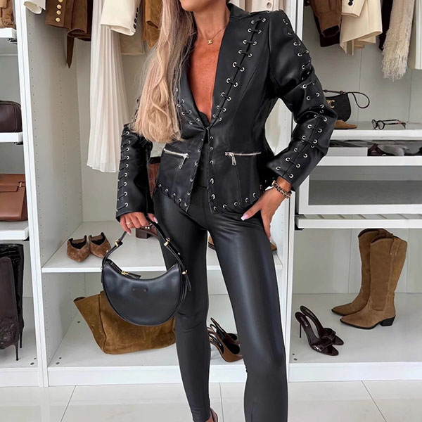 Embrace bold sophistication with this striking jacket that perfectly balances edgy appeal with feminine detailing. The classic black faux leather construction delivers that coveted rock-and-roll aesthetic while remaining cruelty-free and versatile enough for multiple styling approaches. The distinctive lace-up detailing adds unexpected feminine charm and visual interest, creating a beautiful contrast against the structured leather silhouette that softens the overall look without compromising its commanding presence. Ideal for creating statement outfits that work over everything from flowing dresses for unexpected contrast to fitted jeans and tees for classic cool.