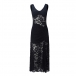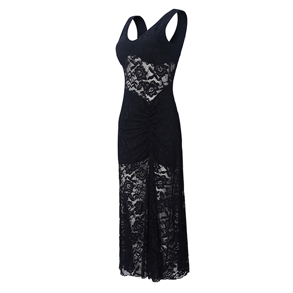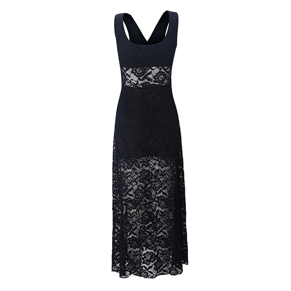 Women's Black Floral Lace Maxi Dress - Sheer Illusion V-Neck Bustier Maxi with Side Split